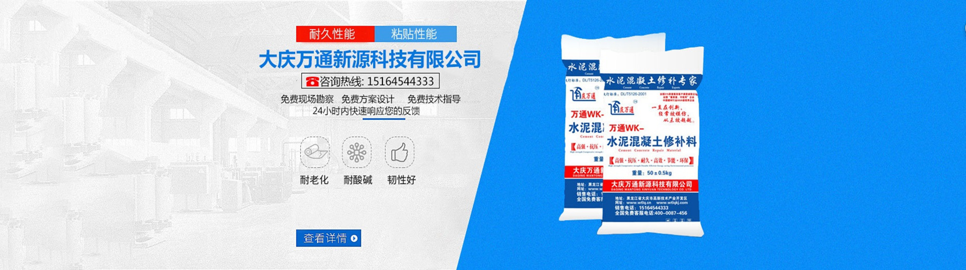 大慶萬通新源科技有限公司獨有的混凝土路面高強速補料,是水泥混凝土路面病害修復的好材料。疲勞、凍融循環、彎曲壓力、滲水和基層破壞等原因都會引起水泥路面的破損,從而帶來高昂的維護費用。與以往的剛性修補方法不同,混凝土水泥路面維修速補膠提供了一種獨特的柔性修補產品和技術,高柔性、高抗拉性,可跨伸縮縫施工和高抗壓性使得混凝土快補產品為水泥混凝土路面提供了******性的修補。傳統的剛性修補方案,如環氧砂漿和快干水泥產品,由于其自身的粘結失效,抗疲勞性低以及與原路面不同的伸縮系數,修補面會在短時間內失效或產生新的裂縫,需要反復修補,有效期短且費用高昂。大慶萬通新源科技有限公司的混凝土水泥路面維修速補膠可以隨原路面一起伸縮,移動,從而避免了粘結失效和產生新裂縫。萬通快補產品優異的粘結性、柔韌性和高防滑性,特別適用于水泥路面的淺層粘合修補,多邊角混凝土板層修補,跨伸縮縫修補以及路面沉陷修補。萬通混凝土病害修補料針對混凝土起皮起沙、斷板裂縫、蜂窩麻面、坑槽露石子、漏筋掉皮、橋梁的掉皮漏筋快速通車使用時間長。應用萬通快補產品,施工后一天就可以恢復交通。大慶萬通新源科技有限公司的萬通水泥路面維修速補膠適用于高速公路、機場路面、農村村村通路面、廠坪、學校操場、市區公路、小區路面、橋梁、水泥路面的修補。使用萬通特快補材料修補路面可以一勞永逸! 水泥地面起砂怎么辦,混凝土修補劑混凝土地面起砂,混凝土地面修補,地面起砂怎么辦,